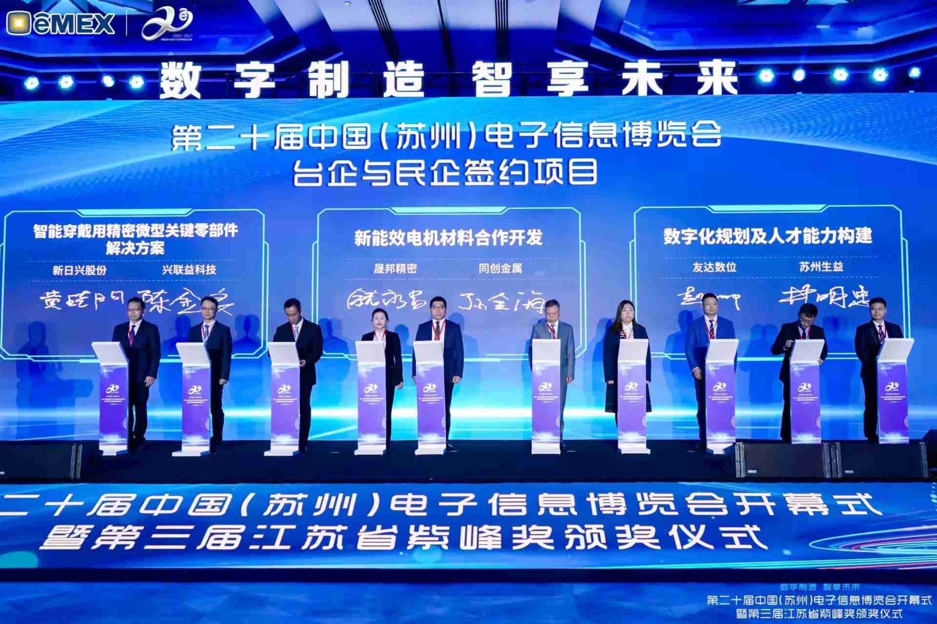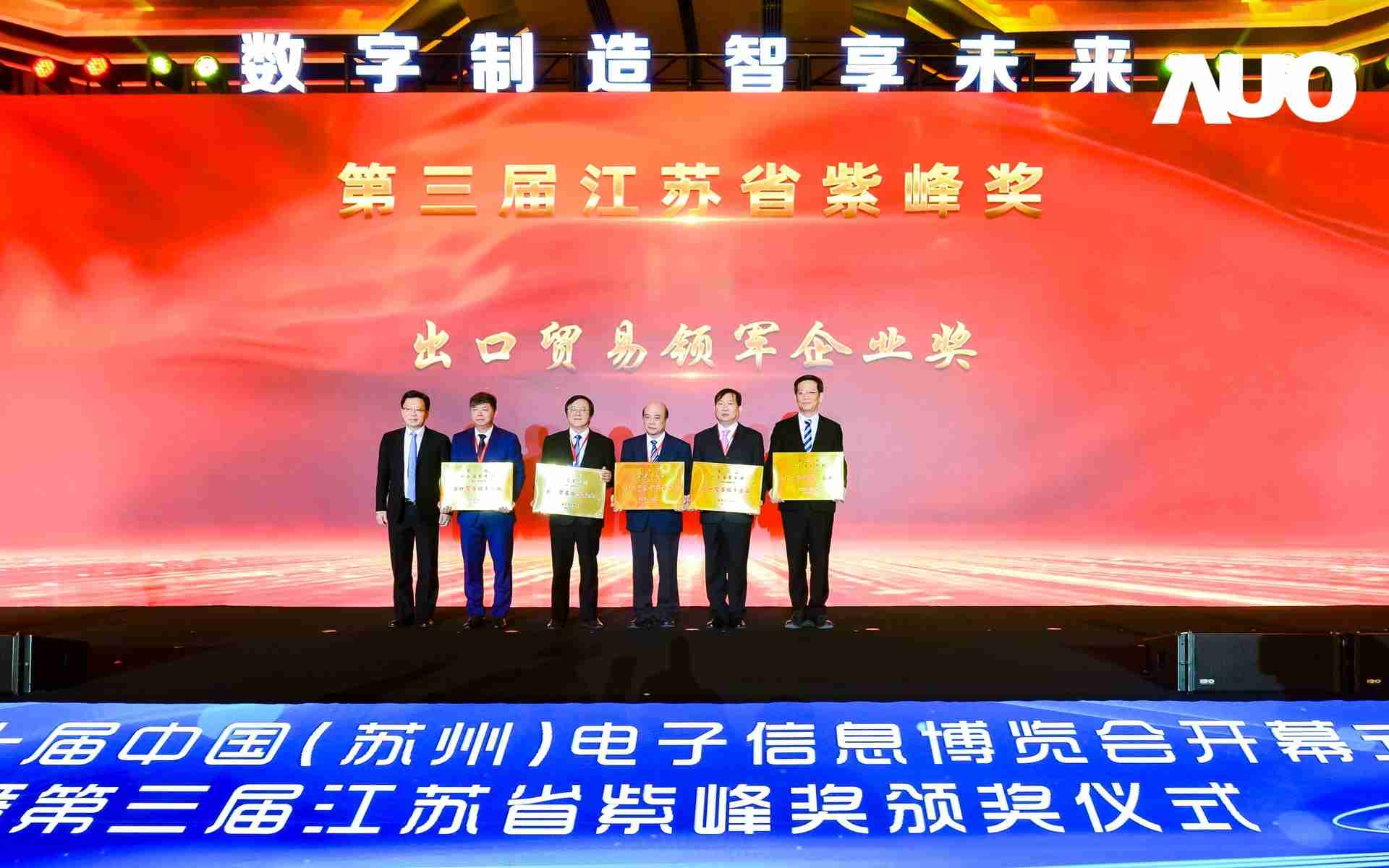 电博会开幕式当天也是第三届江苏省紫峰奖颁奖仪式,,,省台办、、工信厅、、商务厅、、苏州市相关领导均出席并颁奖。。。该奖项为表彰对江苏高质量发展做出积极贡献的在苏企业,,,由江苏省政府专门设立。。。PA直营光电 (苏州) 总经理郭振明代表上台领奖,,这也是PA直营苏州连续三次蝉联紫峰奖 出口贸易领军企业奖。。。。PA直营数位总经理赵丽娜女士,,,,也参与本次开幕式,,上台为本地化赋能签署战略合作协议,,将优质服务资源集合、、下沉到更多细分行业,,,,为更多地区的制造企业提供数字化转型服务。。