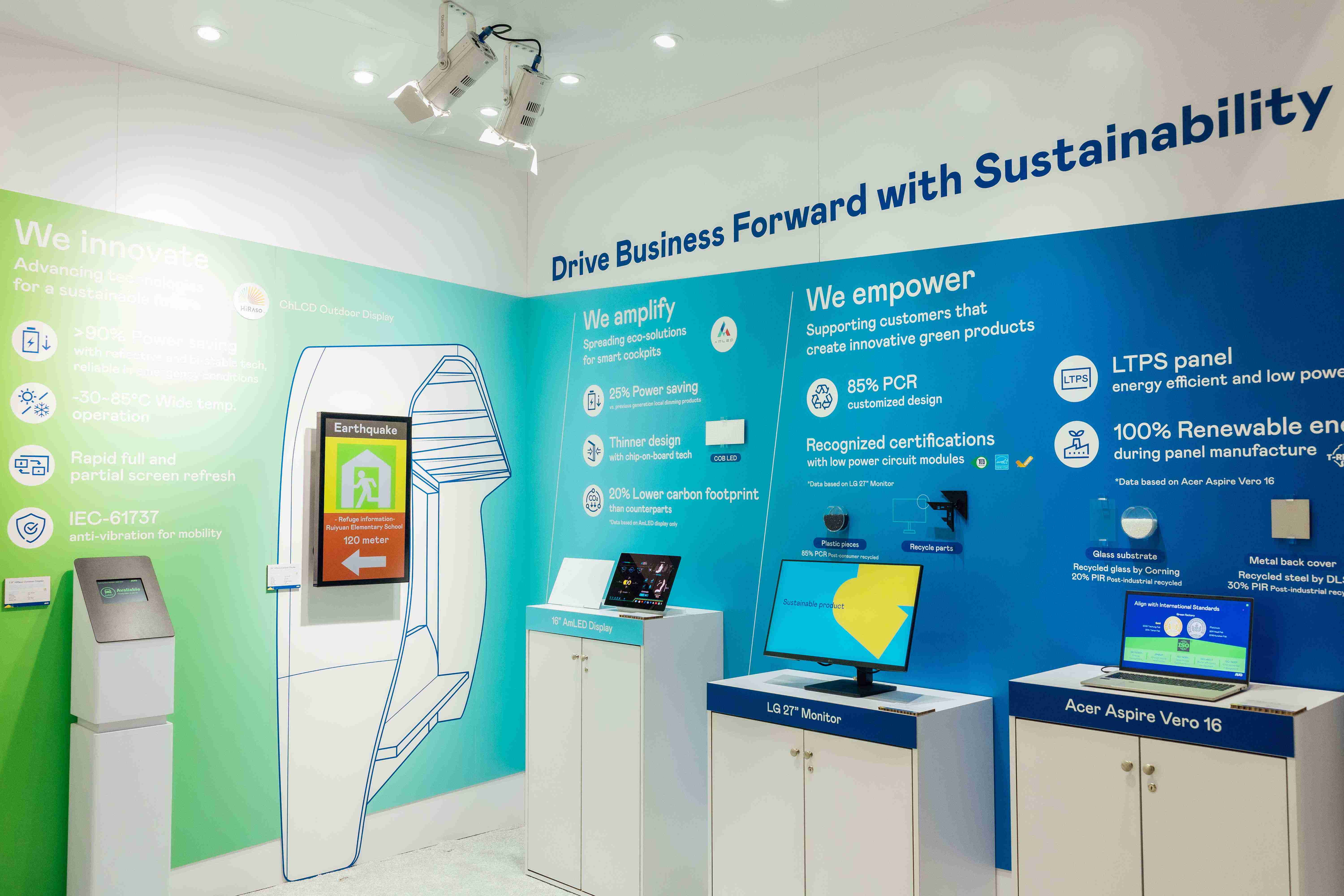 PA直营运用创新显示技术HiRaso胆固醇液晶双稳态技术达到显示零耗能、、、扩大节能省电的AmLED显示技术应用于车用产品、、、、以再生的消费后回收(PCR)塑料及全绿电生产之面板,,应用于笔电及萤幕,,增加绿色价值。。。