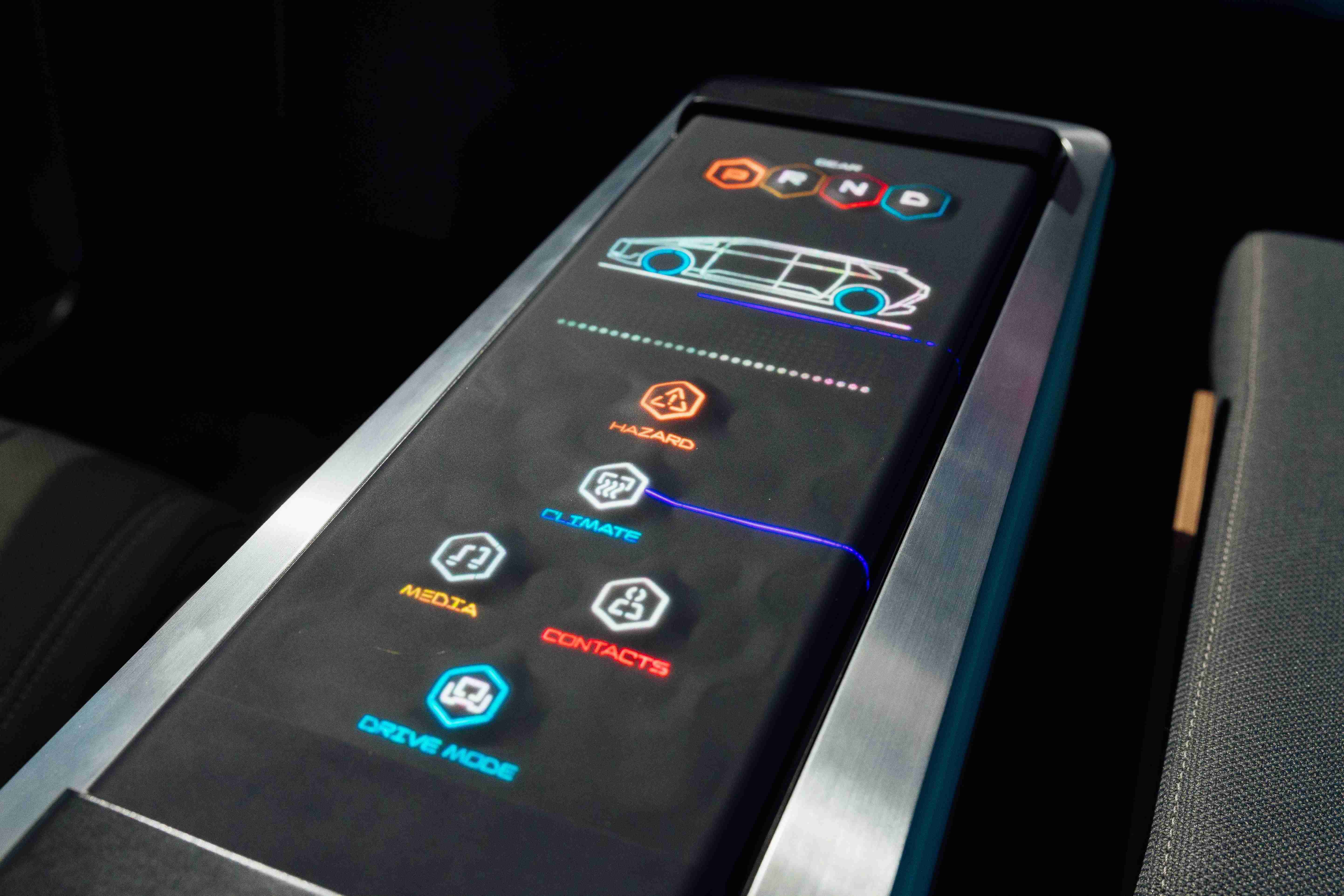 隐藏式智驾介面(Foldable Cruise Pilot)在不同模式下可以切换显示方式,,,在手动驾驶模式时,,,显示器可以在半收合状态下,,,仍呈现所需资讯;自驾模式时,,显示器可以完全展开,,,满足不同的多媒体娱乐需求。。。 PA直营Smart Cockpit 2025 在车头及车尾搭载合作伙伴Ennostar开发的互动式矩阵显示器(Interactive Matrix Display),,,其突破传设计框架,,,,利用优化的光源整合技术,,提供更高亮度与对比度的显示效果,,,营造驾车者个性化风格并传递讯息。。