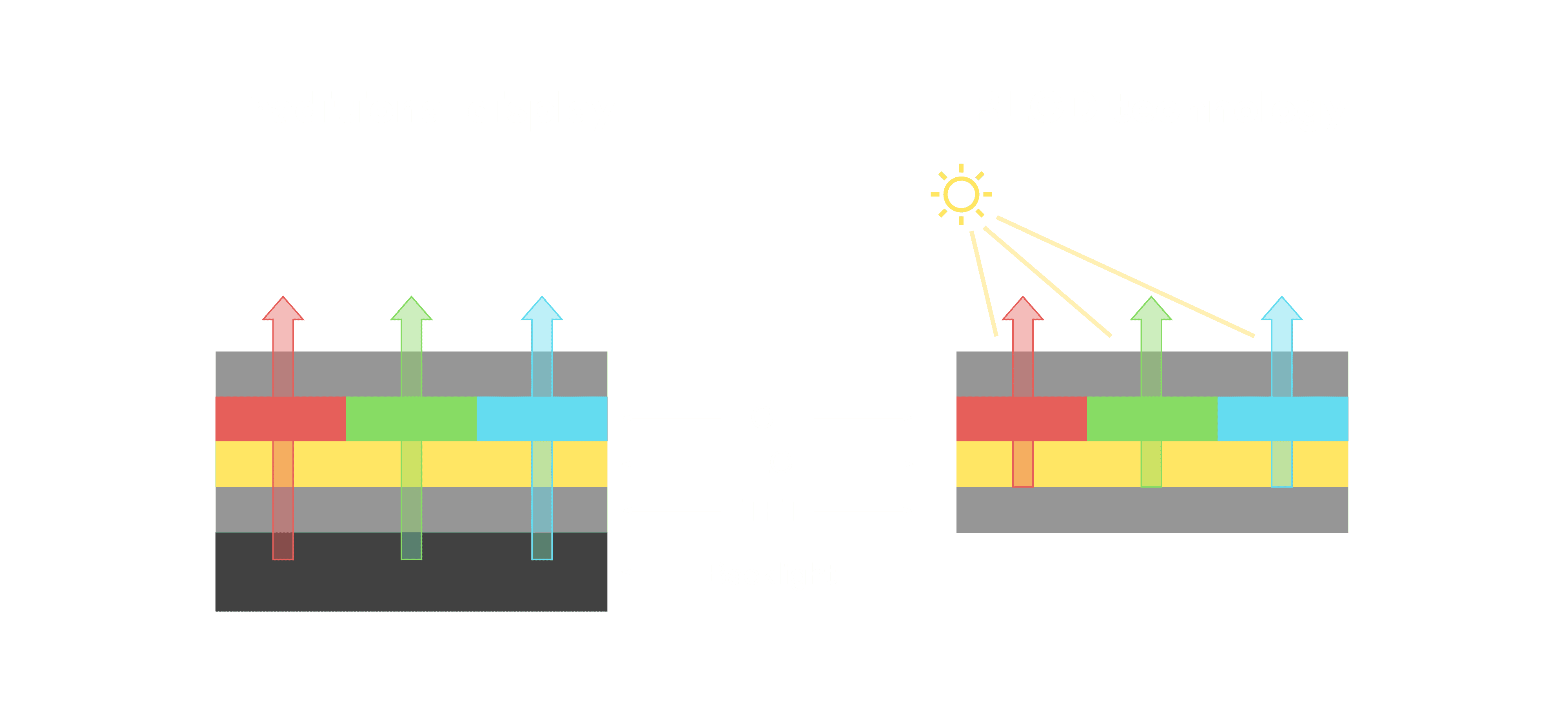 与传统需搭配背光单元的液晶显示相比,,,,反射式液晶技术不仅更省电、、更轻薄,,且即便在艳阳下仍能清晰显示。。。。此外,,,,少了背光单元,,,也大幅降低了 LED 蓝光伤害眼睛的疑虑。。
