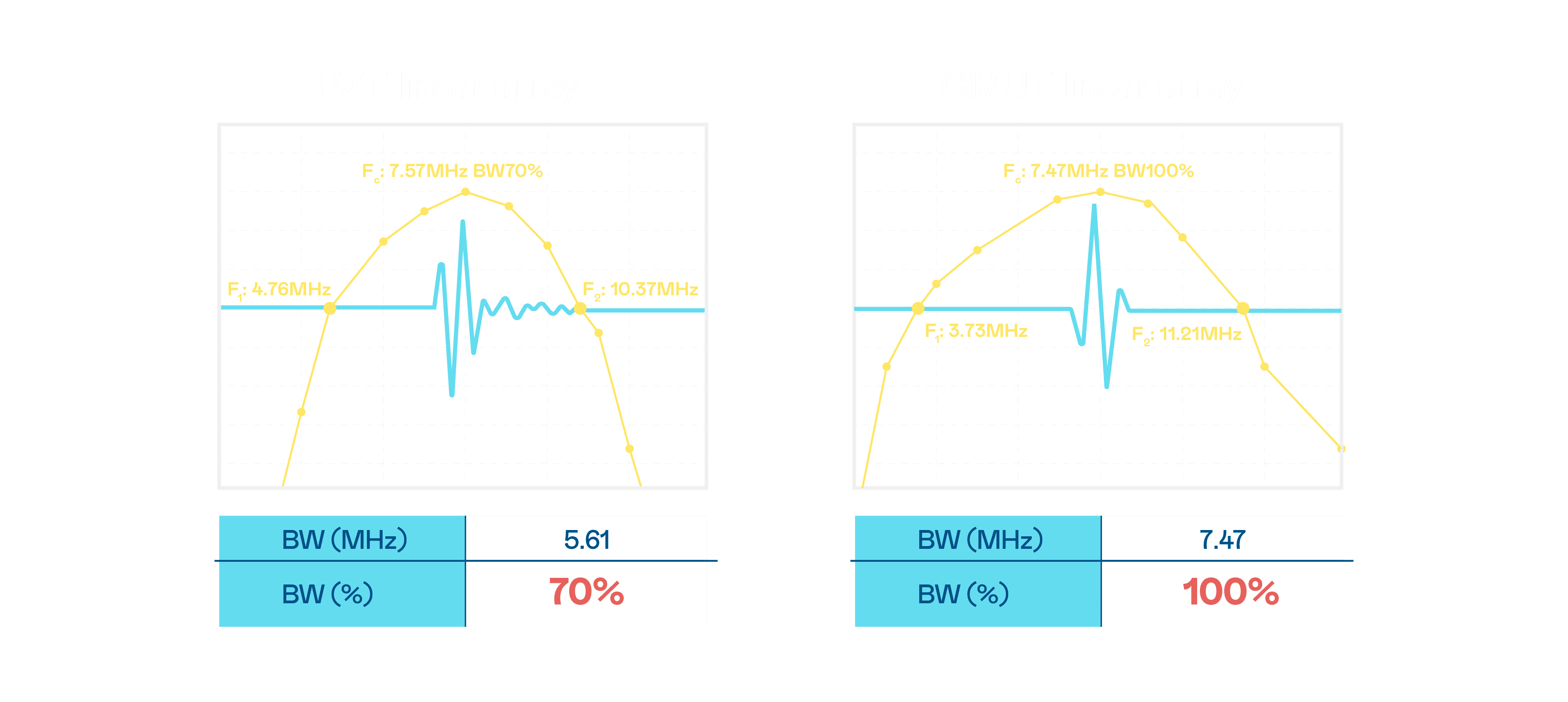 超音波影像的解析度高低,,,首先取决于探头能发出的讯号频宽。。。。PA直营 CMUT 可提供高清晰的超音波讯号,,,提供高频宽、、、高灵敏度、、、、影像纹理细节更高的超音波影像,,,,协助医护人员缩短影像判读时间及利用精准的医疗影像进行诊断。。。